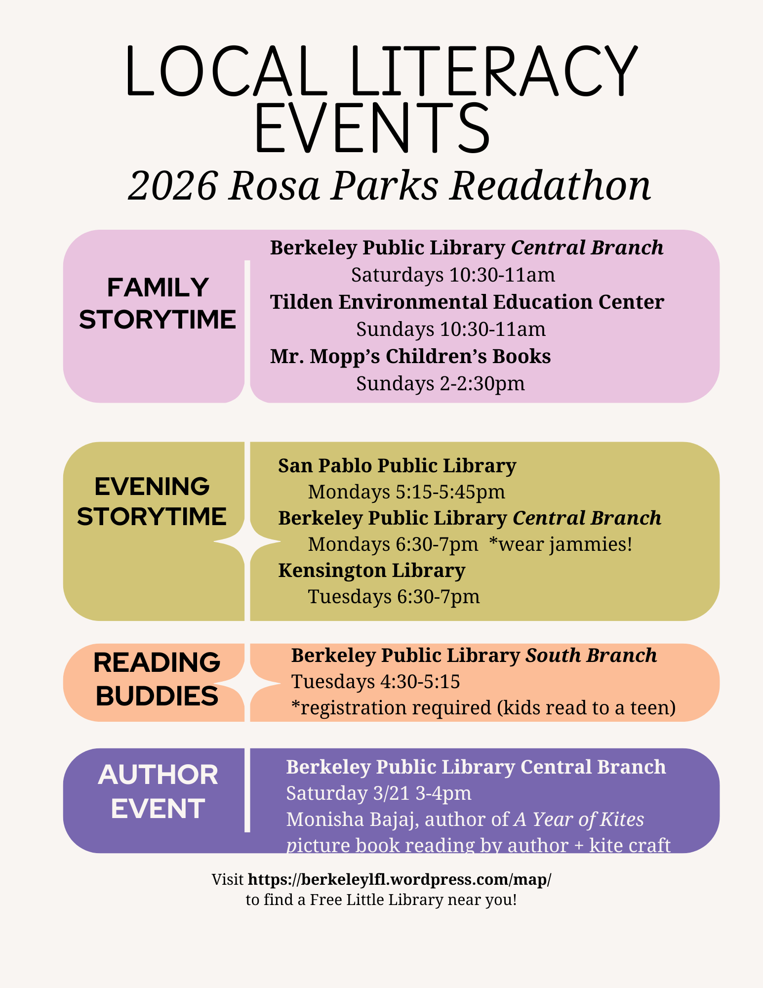 The 2026 Rosa Parks Readathon is taking place March 13–27, and we would love your support. We are currently seeking volunteers to help with the Book Giveaway and the Readathon Kickoff Festival, both of which will be held on Friday, March 13.